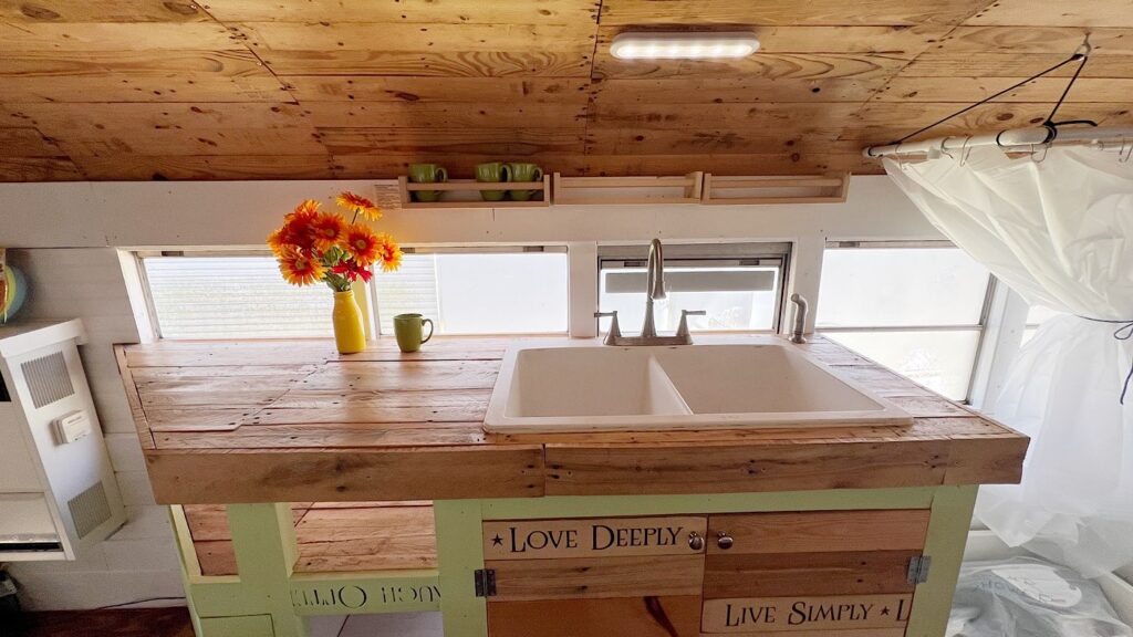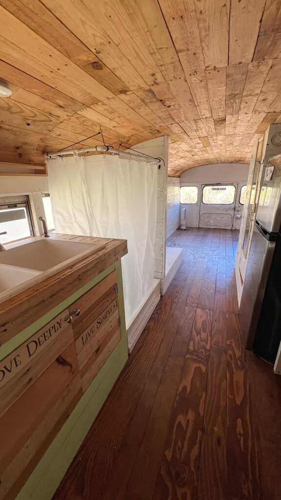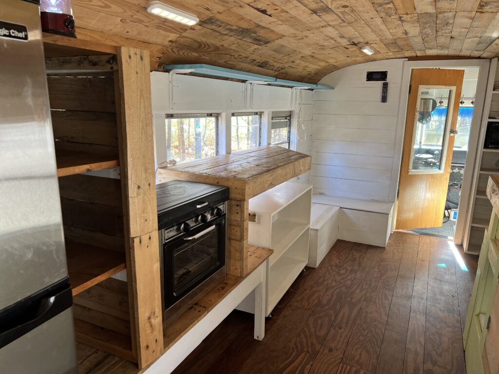 The bathroom features a Natures Head Composting toilet. Works well. It’s hooked up to a solar fan mounted on the roof of the bus that creates a vacuum in the toilet to remove smells.