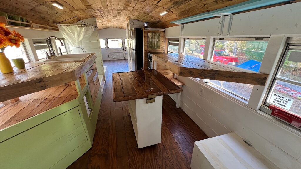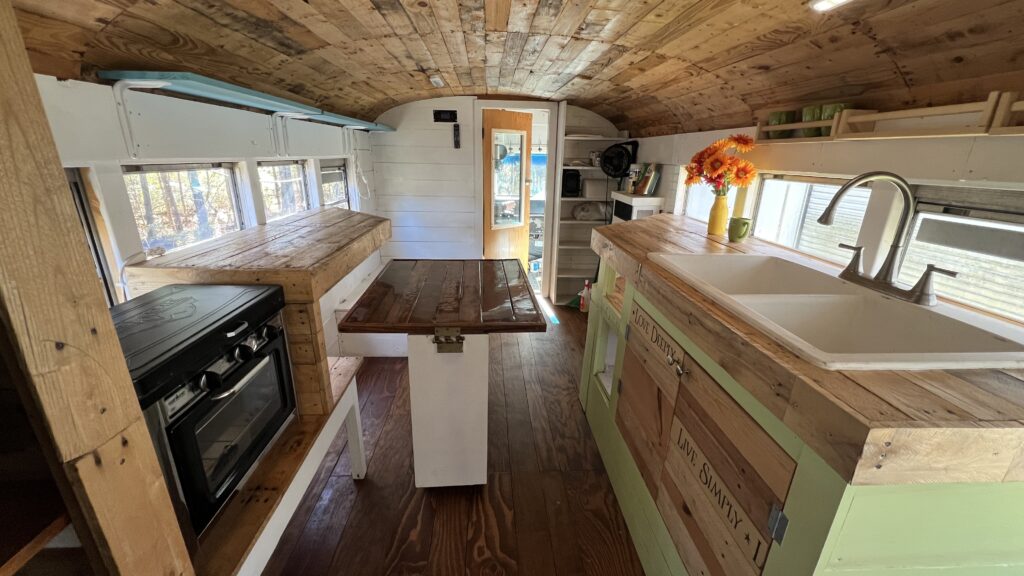 This charming converted GMC Bluebird schoolbus camper is ready to live in! Whether you’re planning a cross-country road trip, looking for a unique tiny home that can thrive off-grid, or want an easy and unique AirBNB or guest house, this classic bus has everything you need to live comfortably and sustainably.