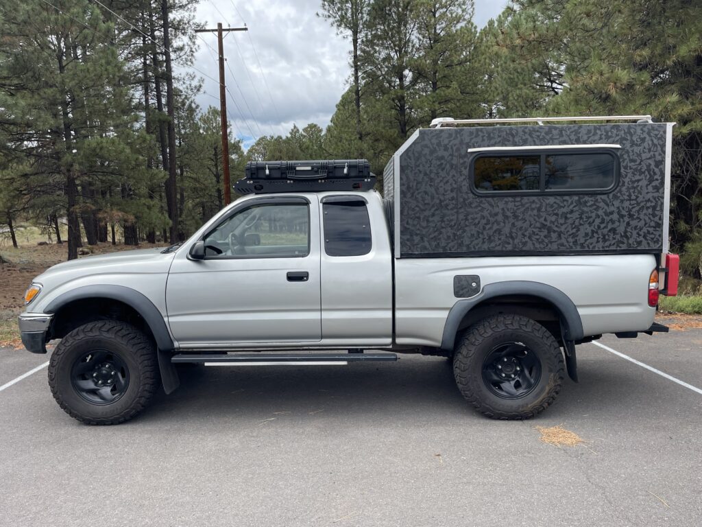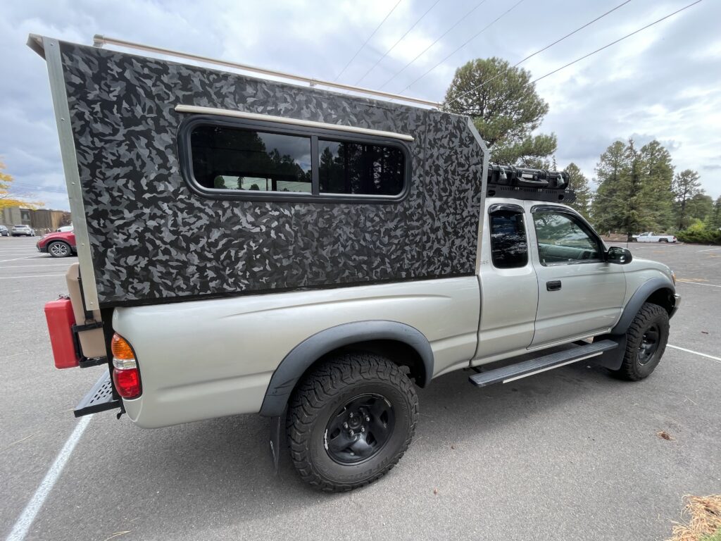 2003 Toyota Tacoma 4×4 camper. Camper shell custom built in 2023. Wood frame and paneling with rigid insulation. Vinyl wrapped exterior. Cab/camper pass through. Interior lighting, AirMaxx exhaust, Hi-Boost cell phone booster, shelving, cabinets, large lockable storage in extended cab area. 36”x75” bed platform with storage.