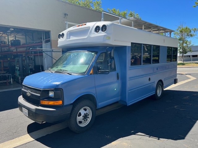 - 2008 Chevy Express Collins School Bus: A solid and reliable platform with approximately 101,000 miles. Equipped with the powerful 6.0L V8 engine, this bus offers plenty of power and about 10-11mpg observed depending on how fast you go. Collins buses have very squared off rooflines so it feels super spacious and we were careful to not overwhelm the roofline with cabinets, following the natural curves of the ceiling corners. 6’2” in the center.