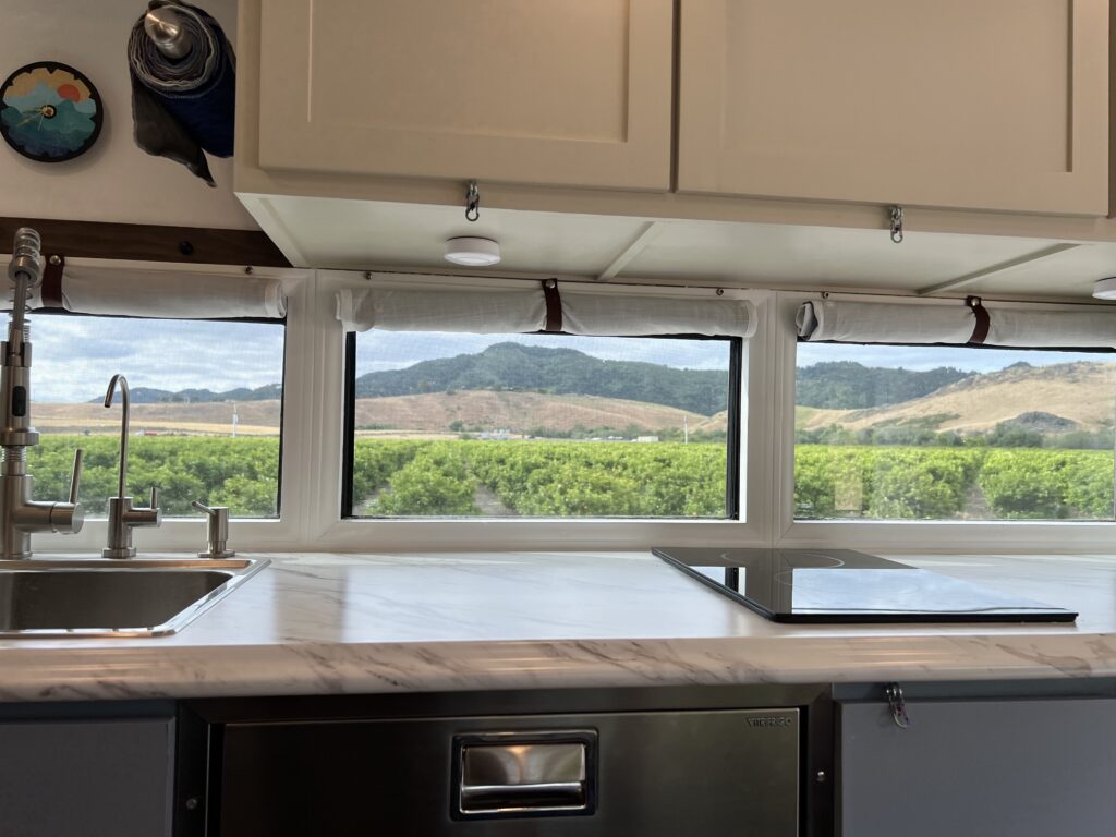 - Bathroom: The bathroom features lightweight vinyl Dumawall that looks like tile, a shower handle with a European-style temperature control valve and a retracting shower door for space efficiency. A new toilet will be provided for your convenience. We recommend a urine diverting toilet which is what we used.
