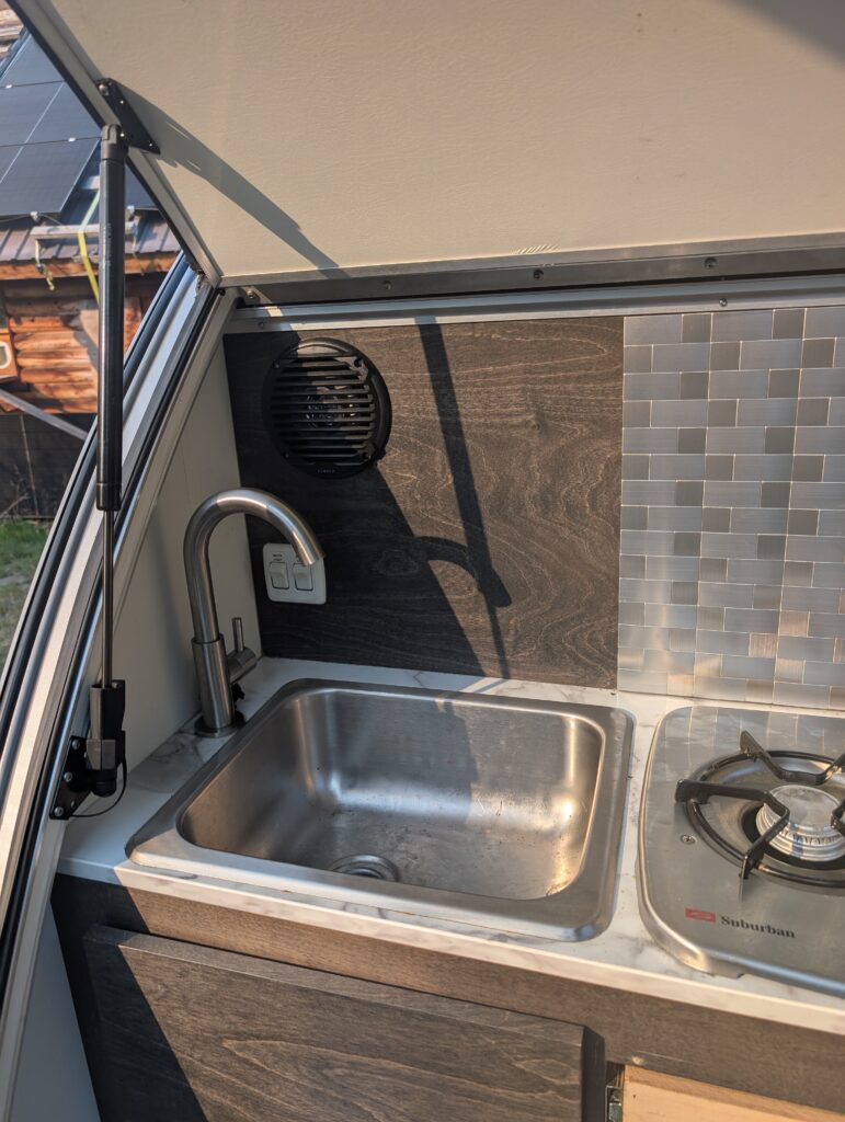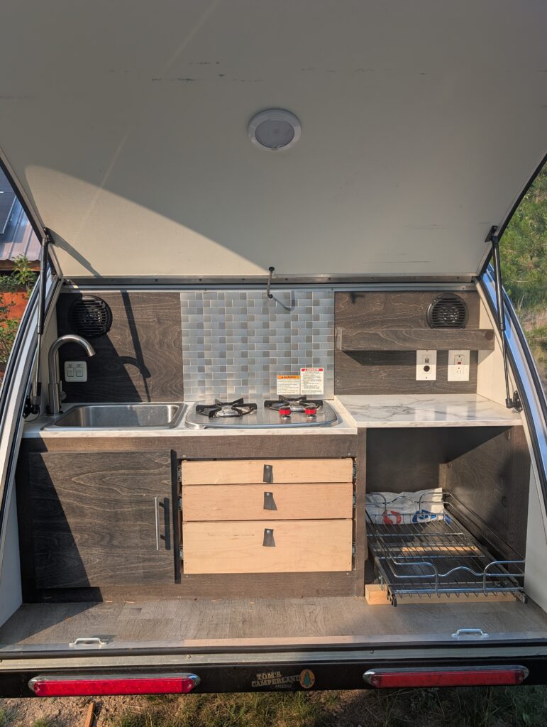 🍳 Galley kitchen (rear hatch): sink, stove, Yeti cooler not pictured but will be included, outlets, storage.