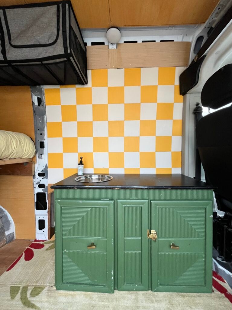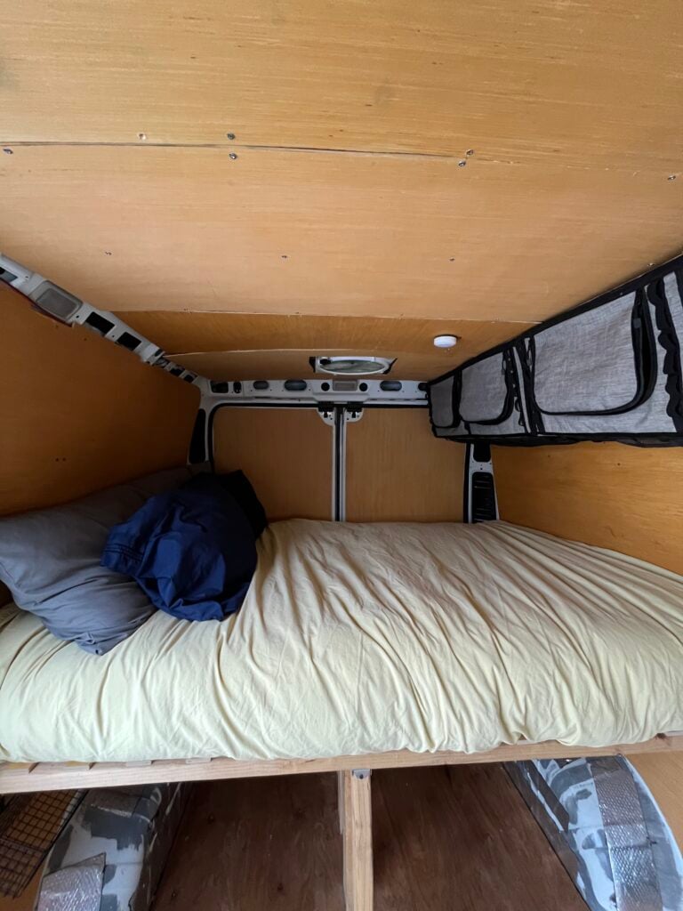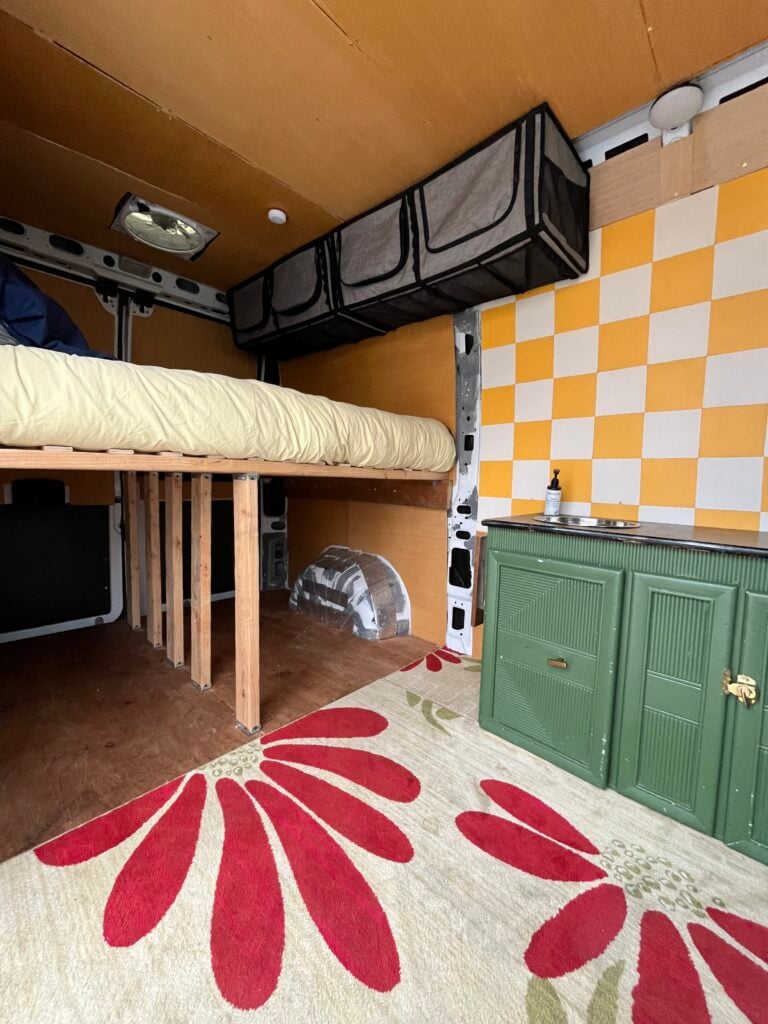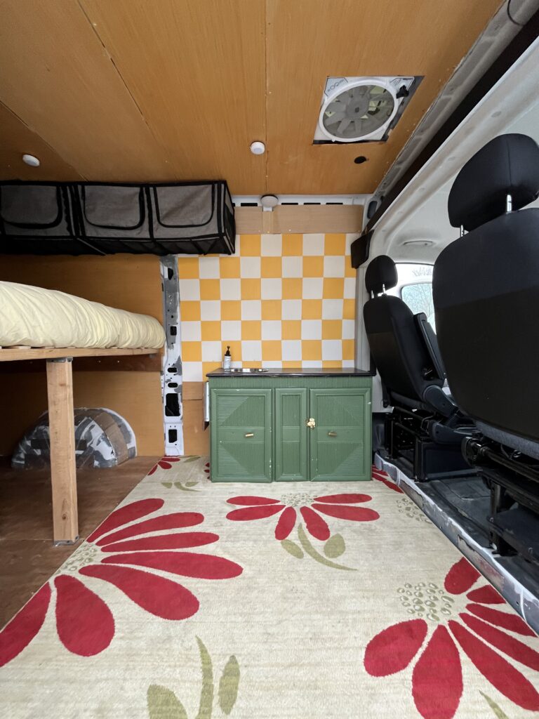 I’ve been working on this van over the last several years- includes full size bed with empty storage space under, two max air fans, two fabric upper cabinets, and a counter top with a sink and cabinets under. It’s adventure ready now, but could also easily be upgraded for someone looking to convert a van!