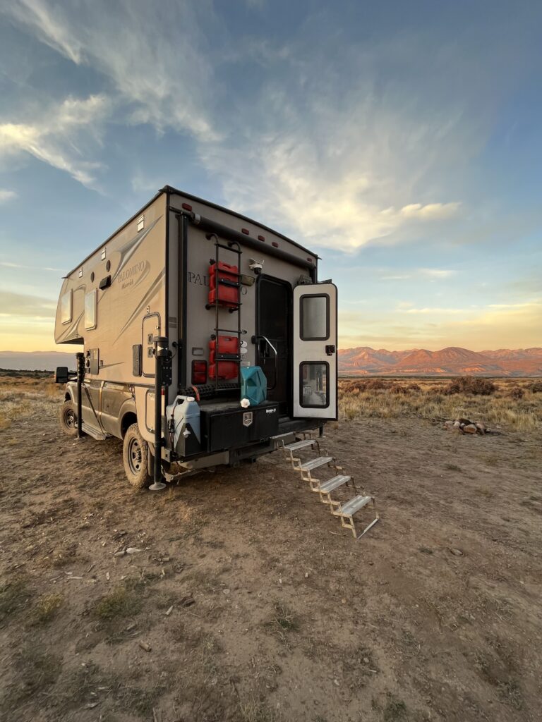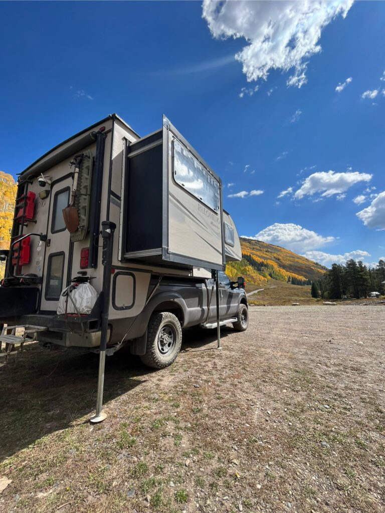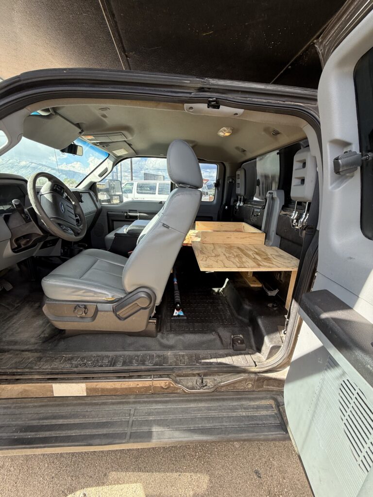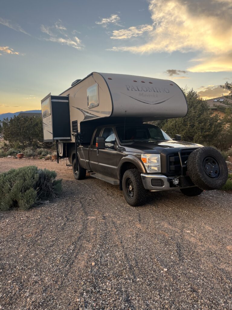 2015 Ford F250 with 118,161 miles.  It was a fleet vehicle until 100,000 miles and has been regularly serviced by myself and the previous owners.  It has an extra long bed, extended cab, is 4×4, and takes gasoline. Great oversized tires. Super reliable, and I’ve never had any issues with it, it has a clean title and is great at hauling the truck camper up and down steep passes and on 4×4 roads.   It also has a custom camera put in that allows you to still see behind you when the camper is on it, and also functions as a dash cam.  The backseat is removed and has been converted to storage space!