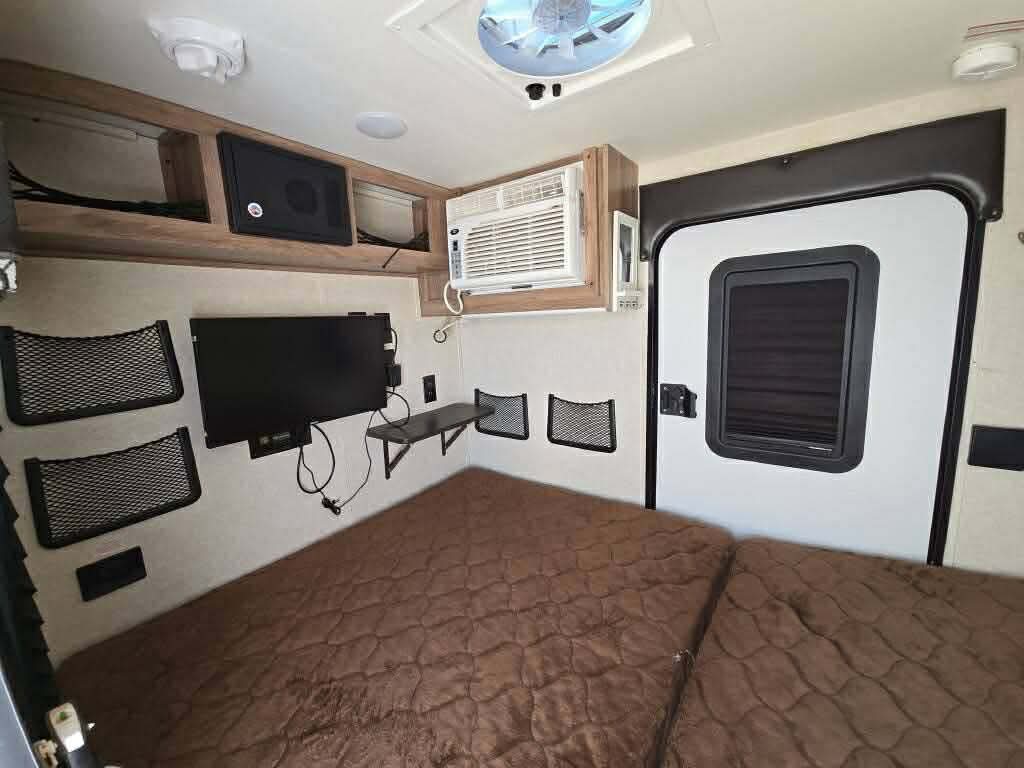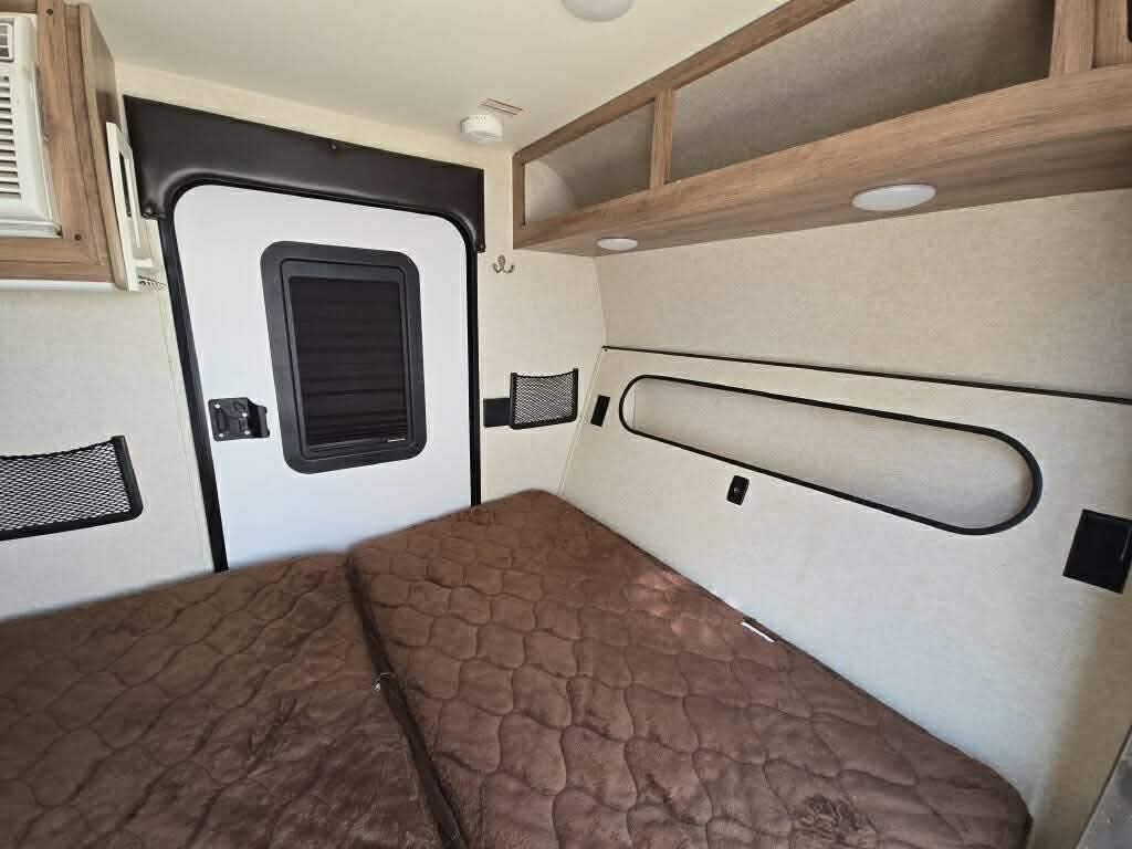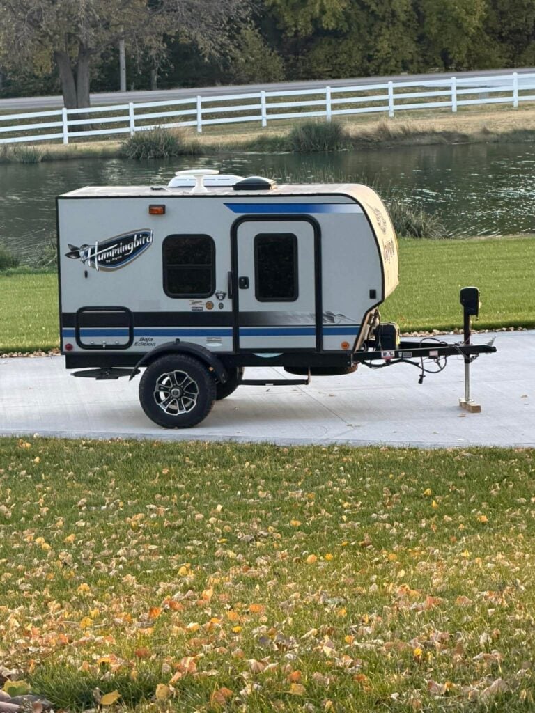 This camper is compact but well equipped and perfect for couples or solo travelers. Easy to store and tow, and great for campsites, lakes, or hunting trips. The only exterior damage is some paint chipping on the fenders.