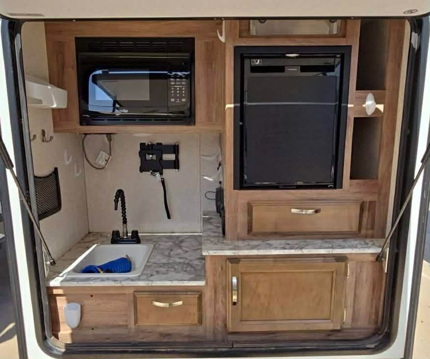 • Rear outdoor kitchen with sink, microwave, and mini fridge