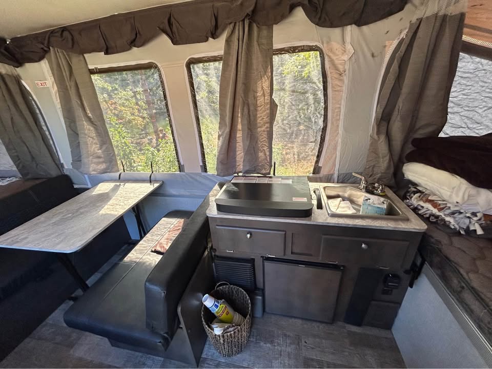 • Bench-style dinette that converts into a sleeping area, LED ceiling lights, TV cable/satellite hookup, and optional Cassette/Porta-Potti new in the box