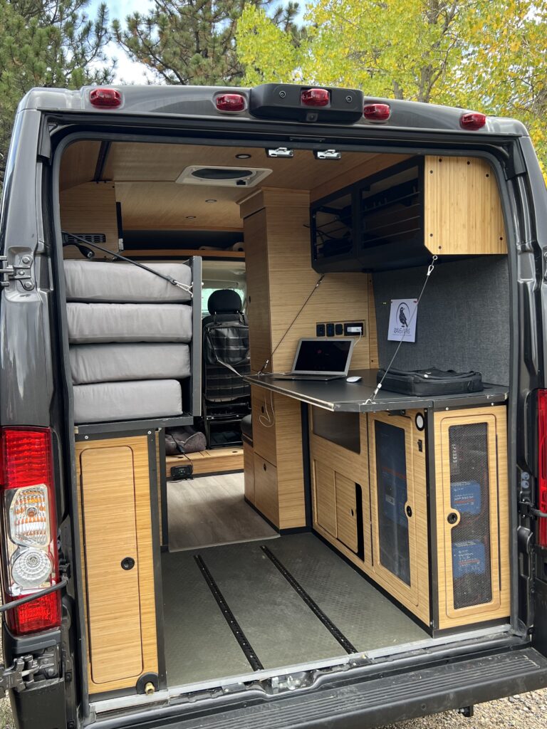 Call me Annabel (or anything else you’d like). I’m Raven Camper Vans 2025 build and I’m specifically designed for someone living on the road. With a work station that has dedicated AC and DC outlets, multiple USB ports and a built-in cork board working from the road is easy. I’m brand new with less than 200 miles.