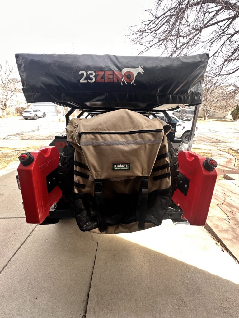 Tailgate: Single swing away, full size spare mounted, rated for 125lb, + 2 x 3gl Rotopax and Trasheroo.