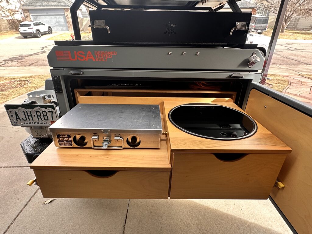 Plenty of tool, utility, and gear storage in tongue box, compartment, and custom gear shelf (tables, chairs, fly rods, etc.), 1” and 2” hitches for bike racks, etc.