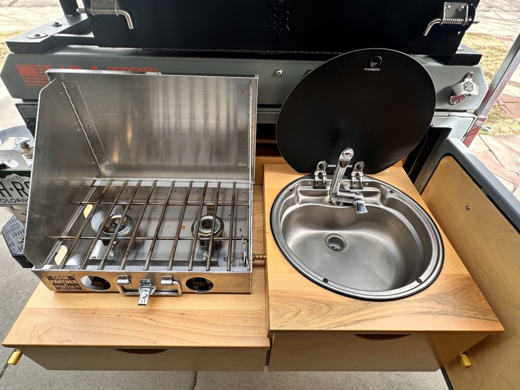 Kitchen: Maple topped birch with Partner 18” stove 20k BTUs x 2 burners, extra deep Dometic stainless steel sink with tempered glass top. Extremely clean!